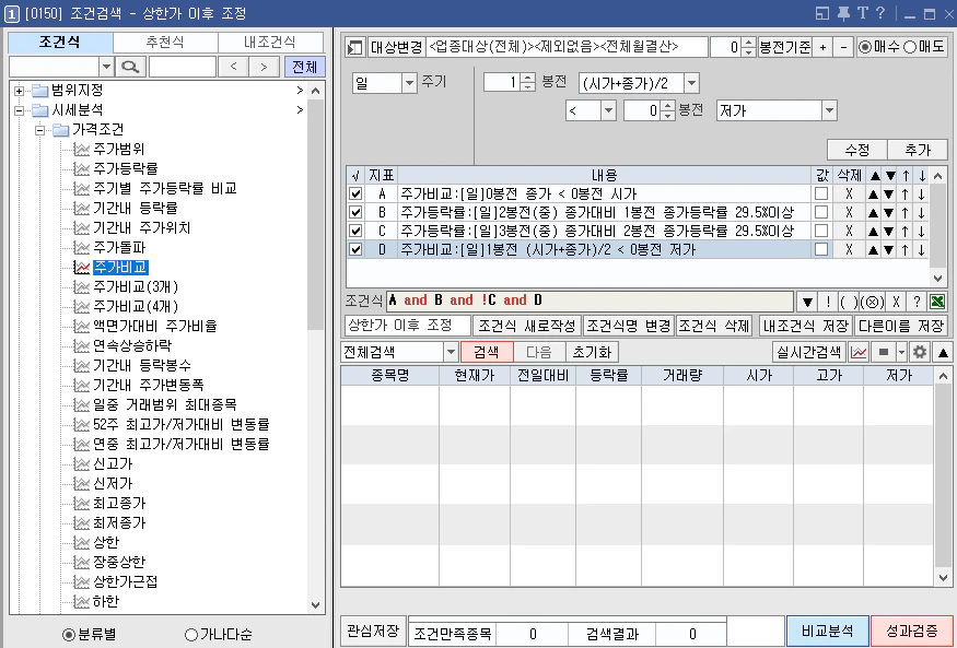 키움증권사 HTS의 조건검색[0150]창을 이용하여 만들어 보겠습니다. 2가지 방법을 소개드리겠습니다.