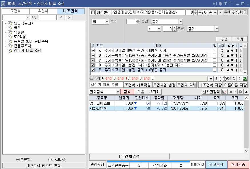 조건을 추가하여 저장 및 검색하면 됩니다. 조건 검색식을 만들고 실시간으로 확인하는 방법은 '조건검색실시간'[0156]으로 확인하여 사용하시면 됩니다.